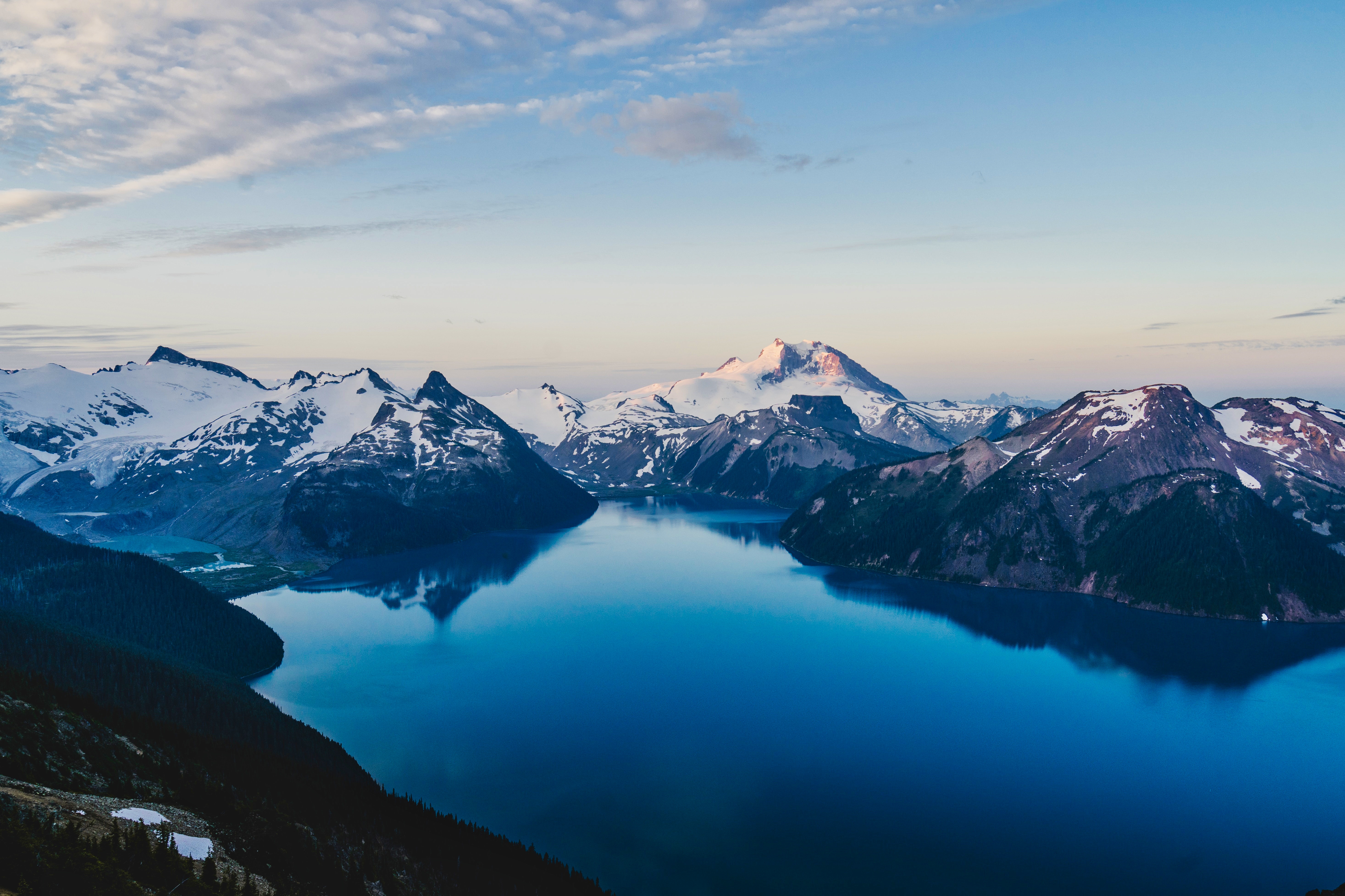 Blue lake surrounded by Snow covered mountains